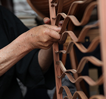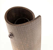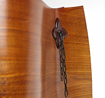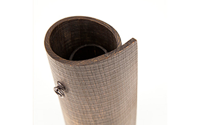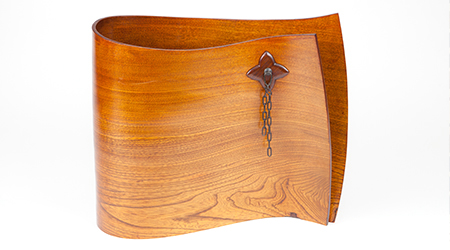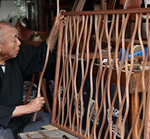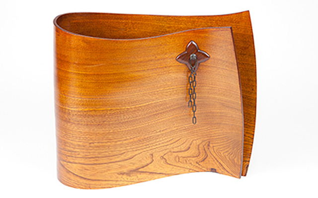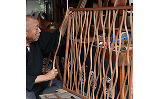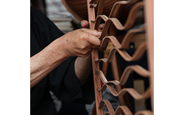 欅や杉の薄板を、お湯に入れて柔らかくしてから曲げ、形を整えます。横曲、縦曲の技法を1つの作品の中で用いているのが特徴です。