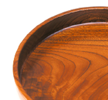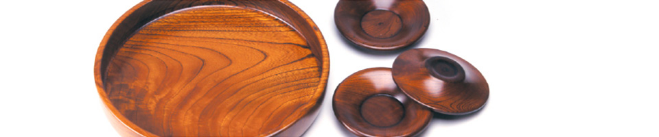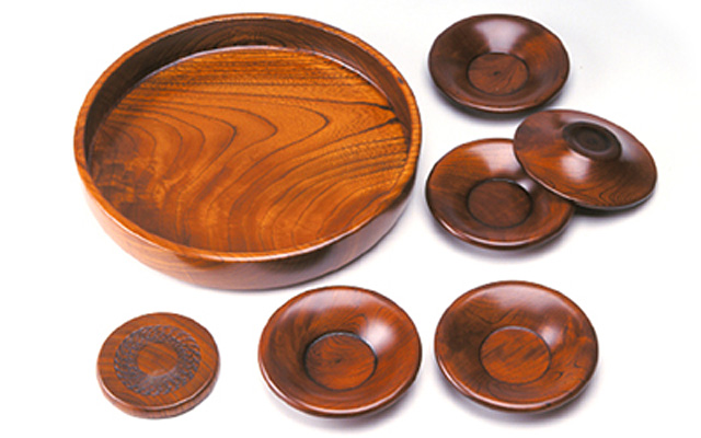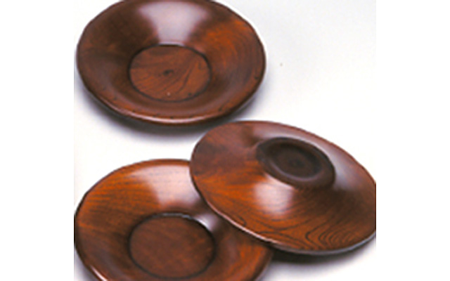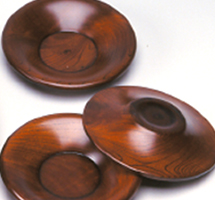 欅等を材料として、ロクロを用いて作られた椀、盆、菓子器などで、生漆塗を施した挽物は、独特の木目の美しさ、柔らかさ、温かさがあります。