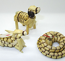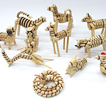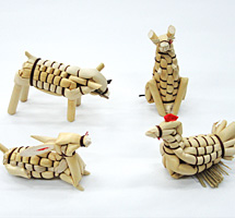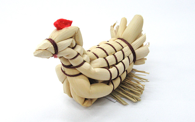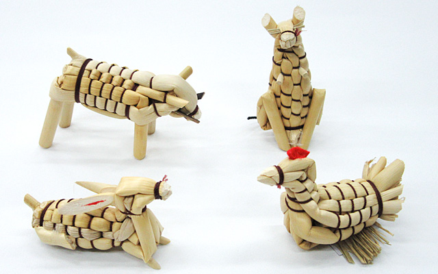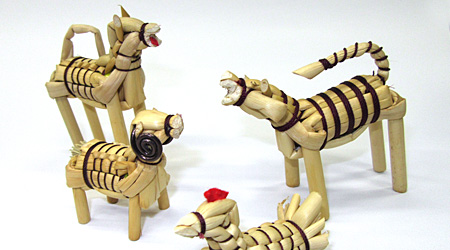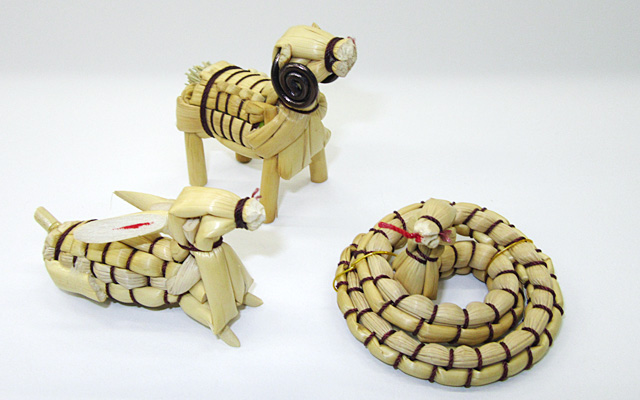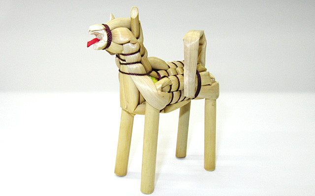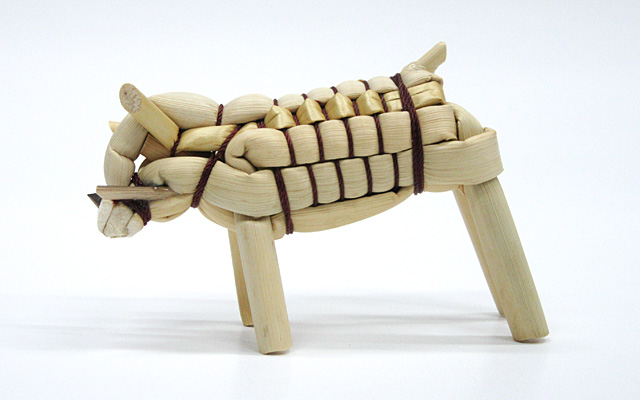 乾燥させた箒草等の茎を使って、干支や鶴亀などの形を作ります。一つ一つに表情があり、素朴で温かみを感じられます。