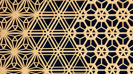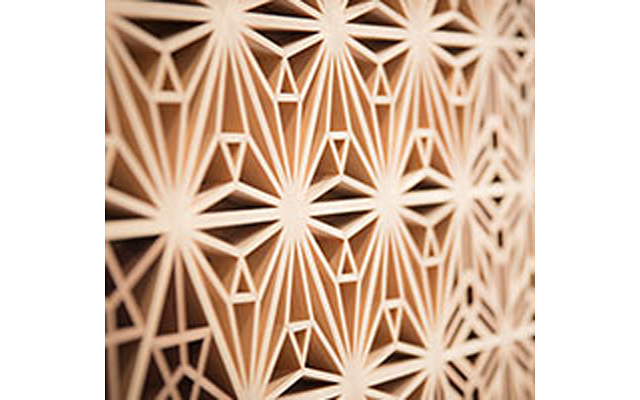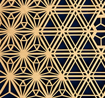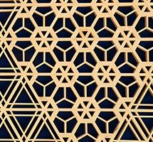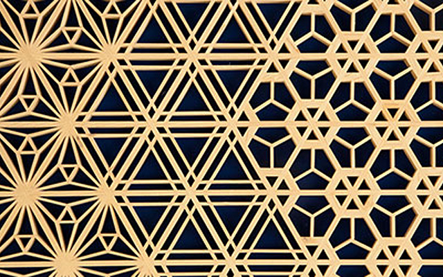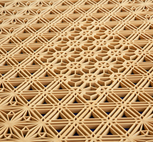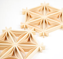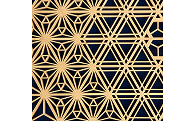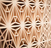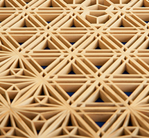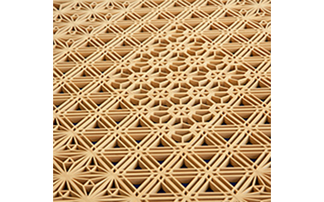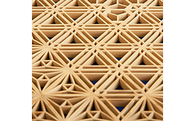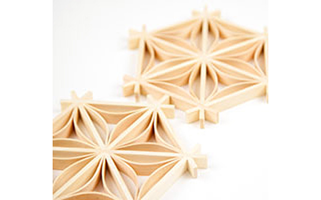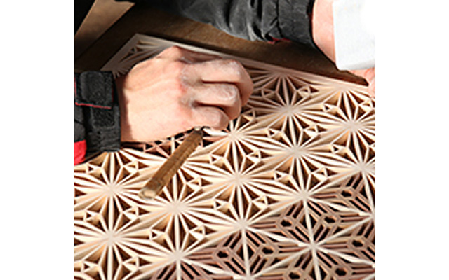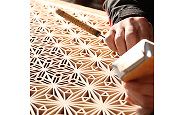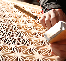 木曽檜・秋田杉・日光杉等を小割にした材料を幾何学模様に組み付けて製造します。書院障子や欄間やインテリア商品に植物等の精緻な模様を美しく表現しているのが特徴です。