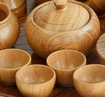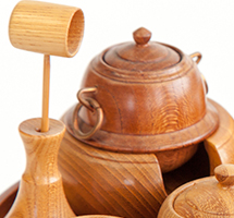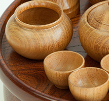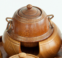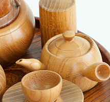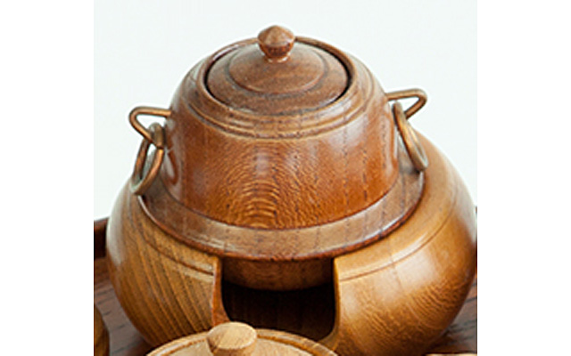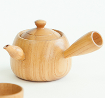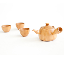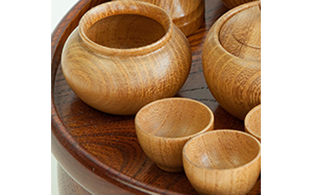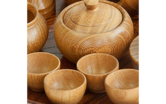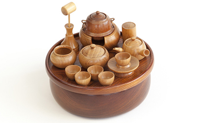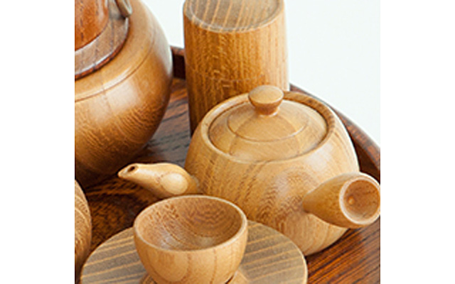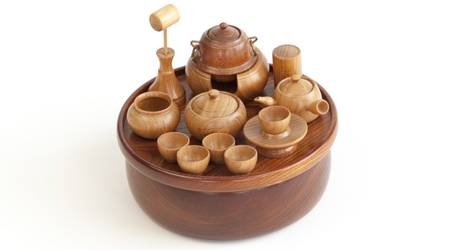 木工のロクロ技術を生かしたミニチュアの茶道具で、桜、花梨、欅等の素材を道具の特色に合わせて使い分けた、味わい深い郷土玩具です。