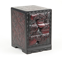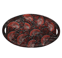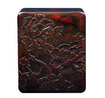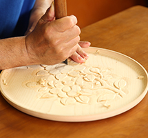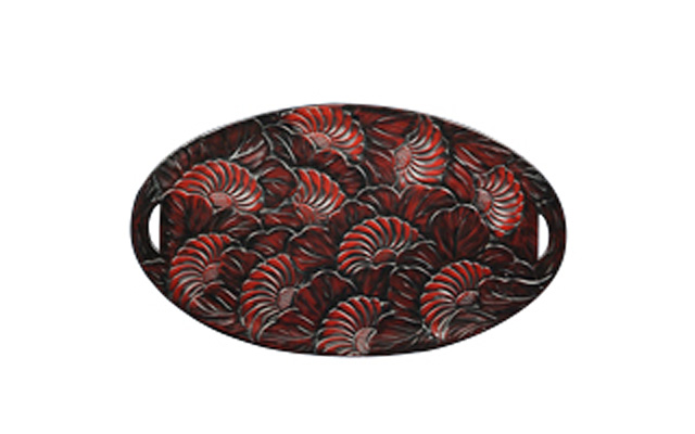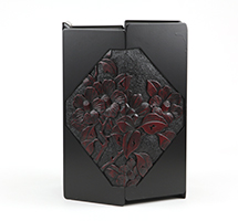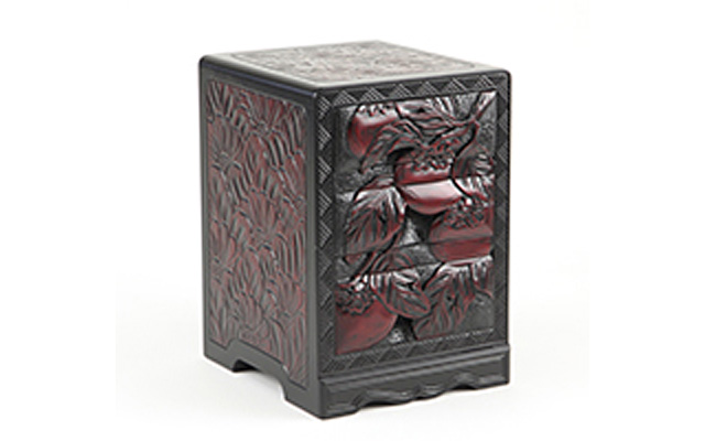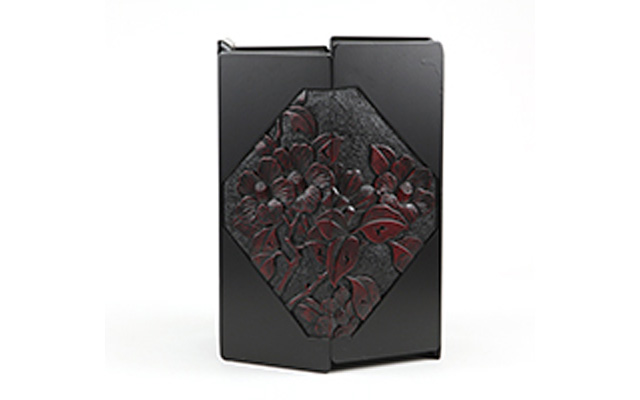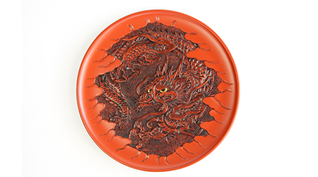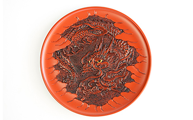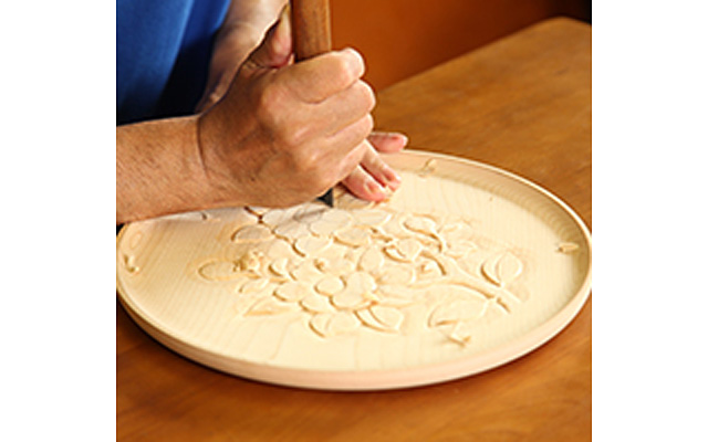 「ひっかき」と呼ばれる独特の道具から生み出される流れるような曲線と材料の美しさを最大限に生かした日光堆朱と呼ばれる漆塗りが特徴です。